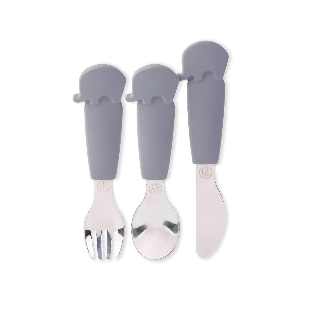 The elephant cutlery sets are available in silver and teal which matches the silicone divider suction plate and bib.Â