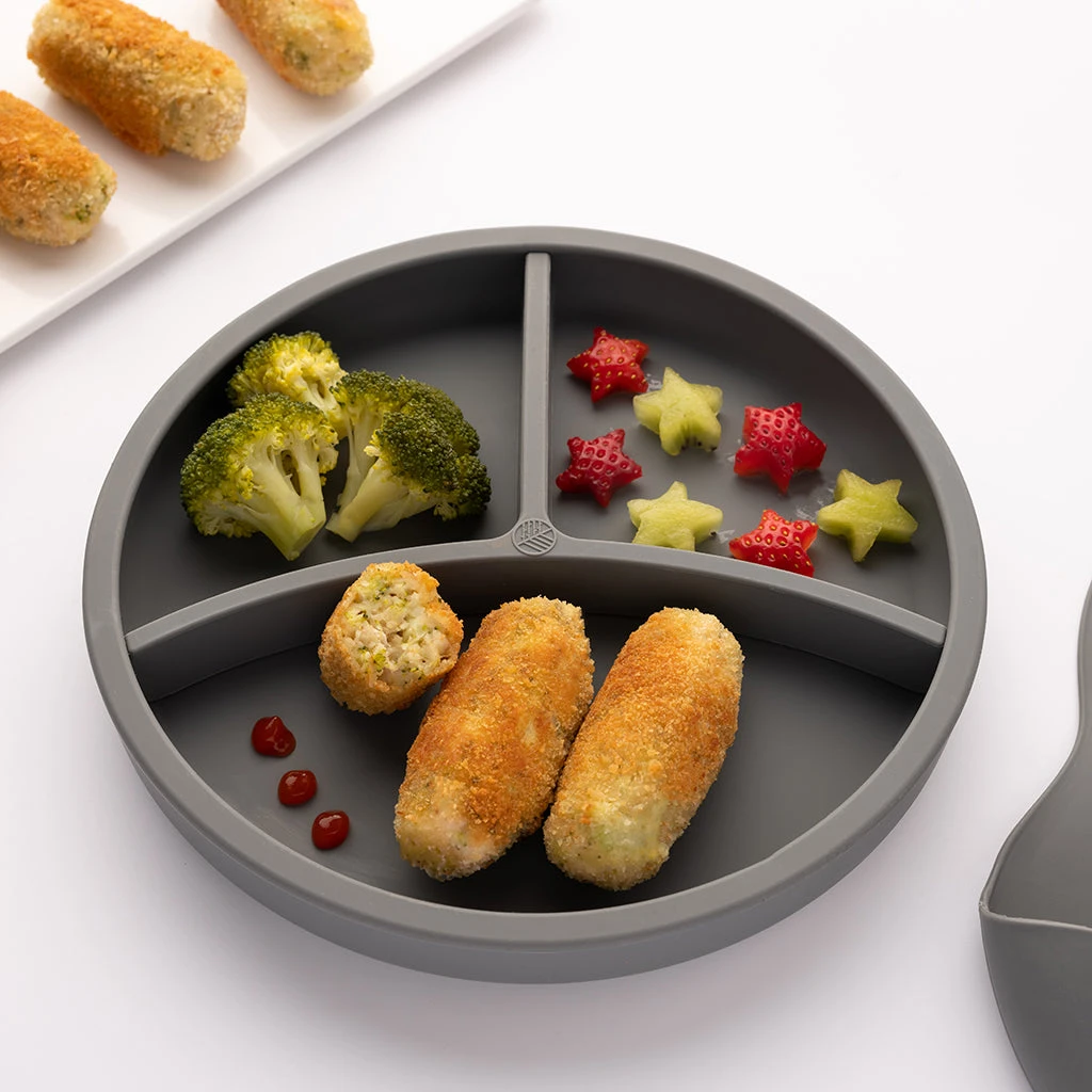 Look at this two in one suction plate! There’s no denying that section plates have become a necessity for any parent embarking on the weaning journey. But, what happens the little one outgrows the sections? The solution, a removable divider that transforms the plate from a three section plate to a regular grown up plate!