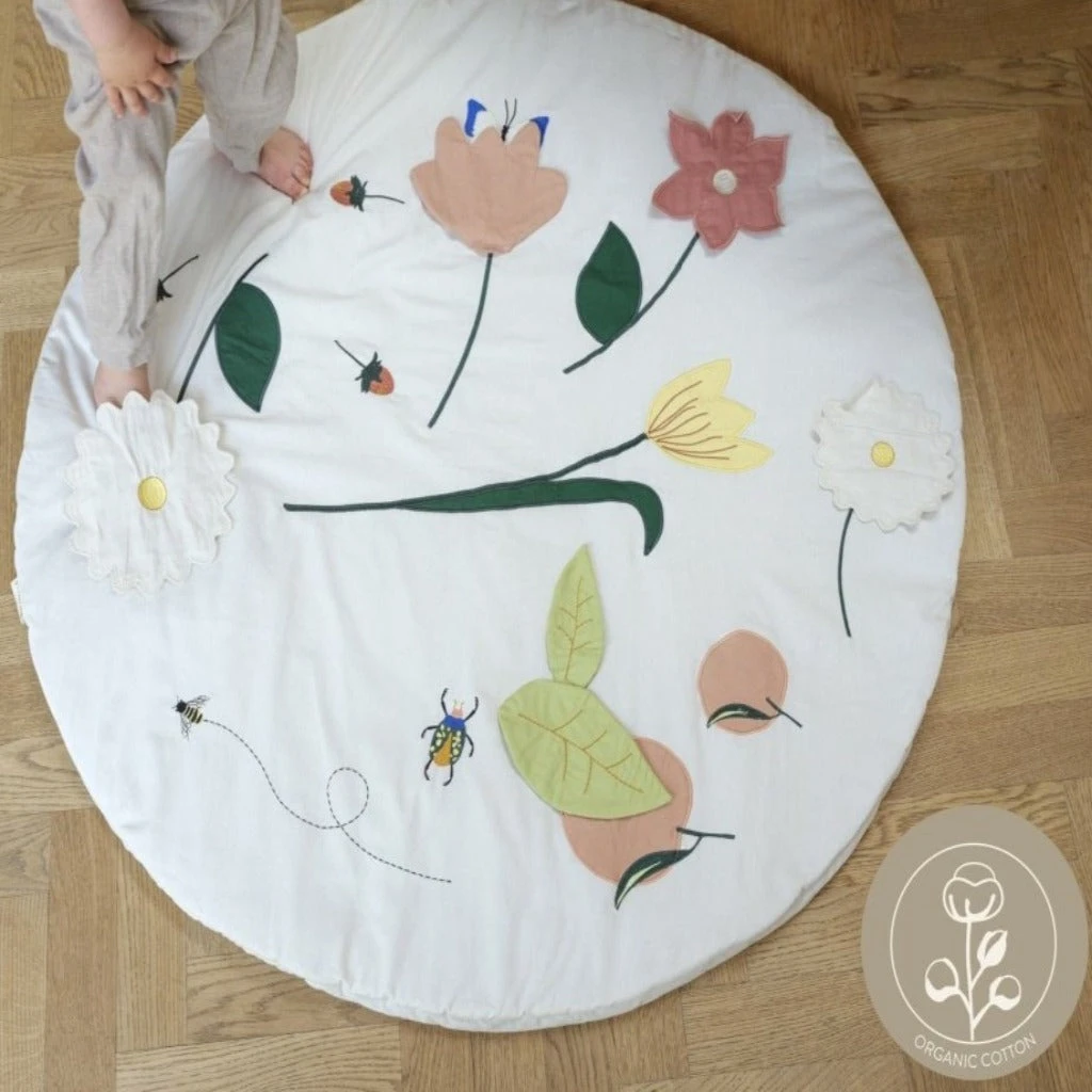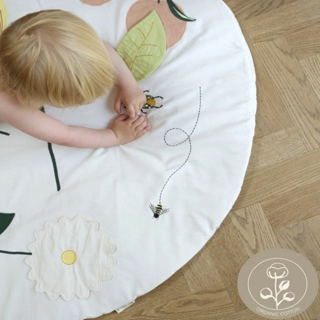 The Fabelab Activity Blanket in Flower gently stimulates baby’s senses with fun pieces to grab onto and explore.