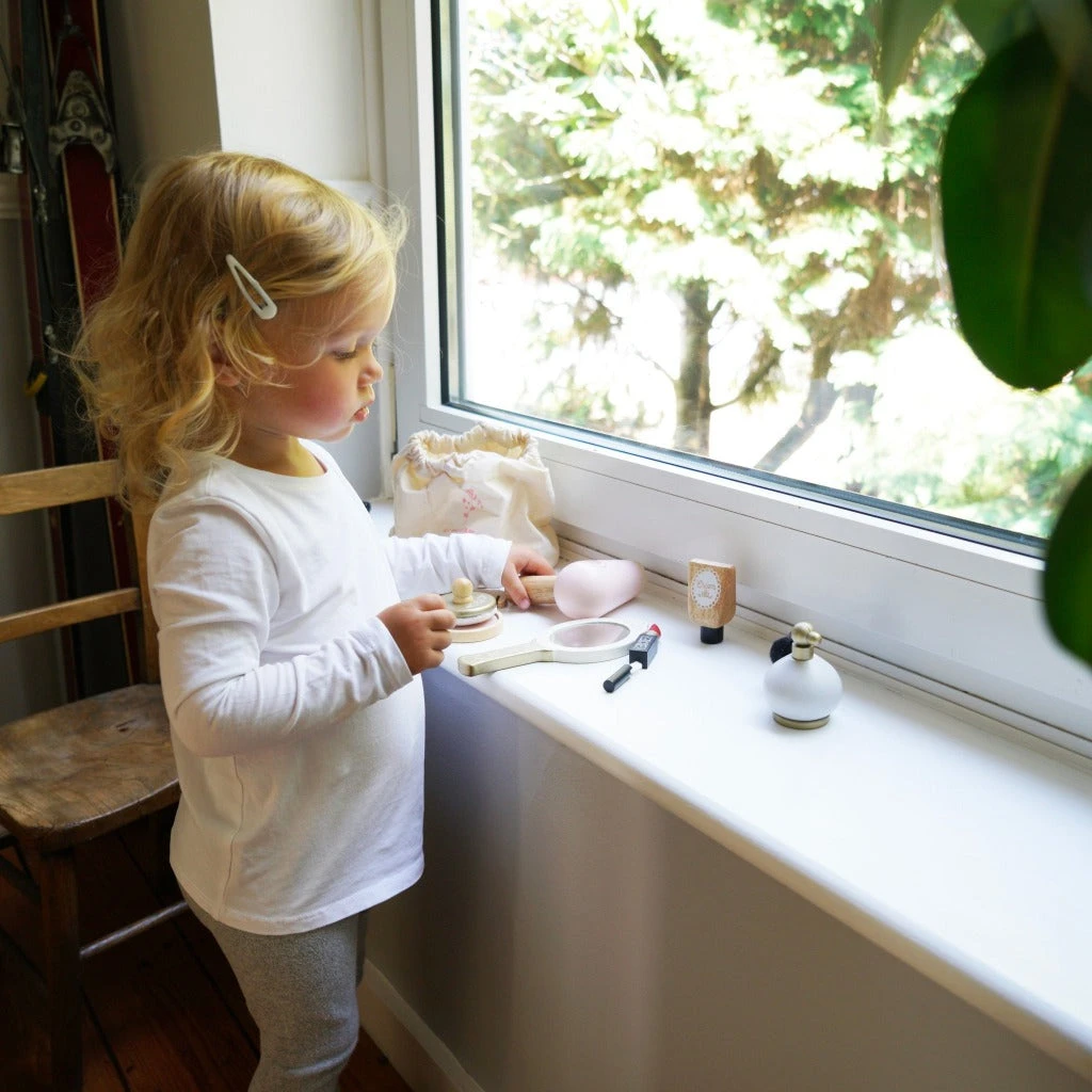Inside the cosmetics bag you’ll find an assortment of wooden accessories including a vintage perfume bottle with a bulb atomiser, a hand held mirror, a hair dryer, a comb, a shell compact make up kit, a lotion, a nail varnish, a lipstick and a powder puff.