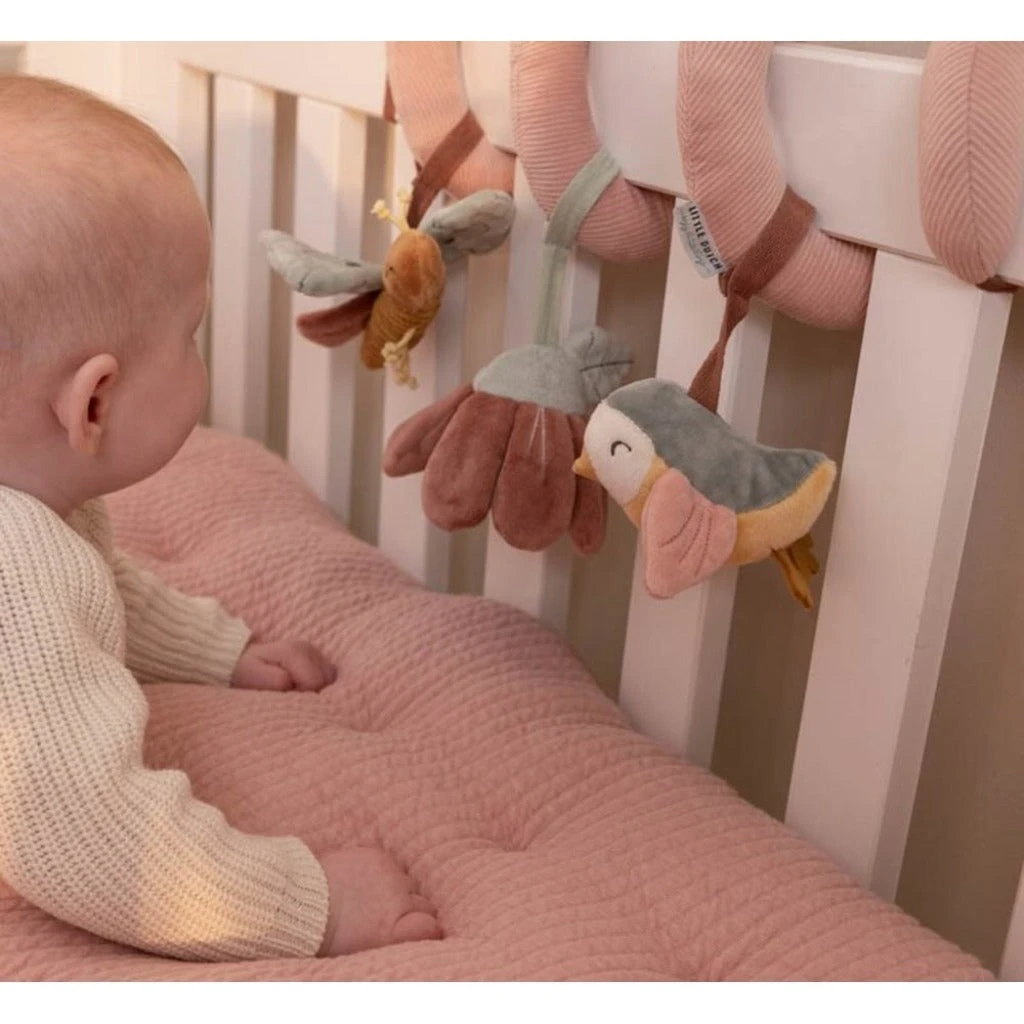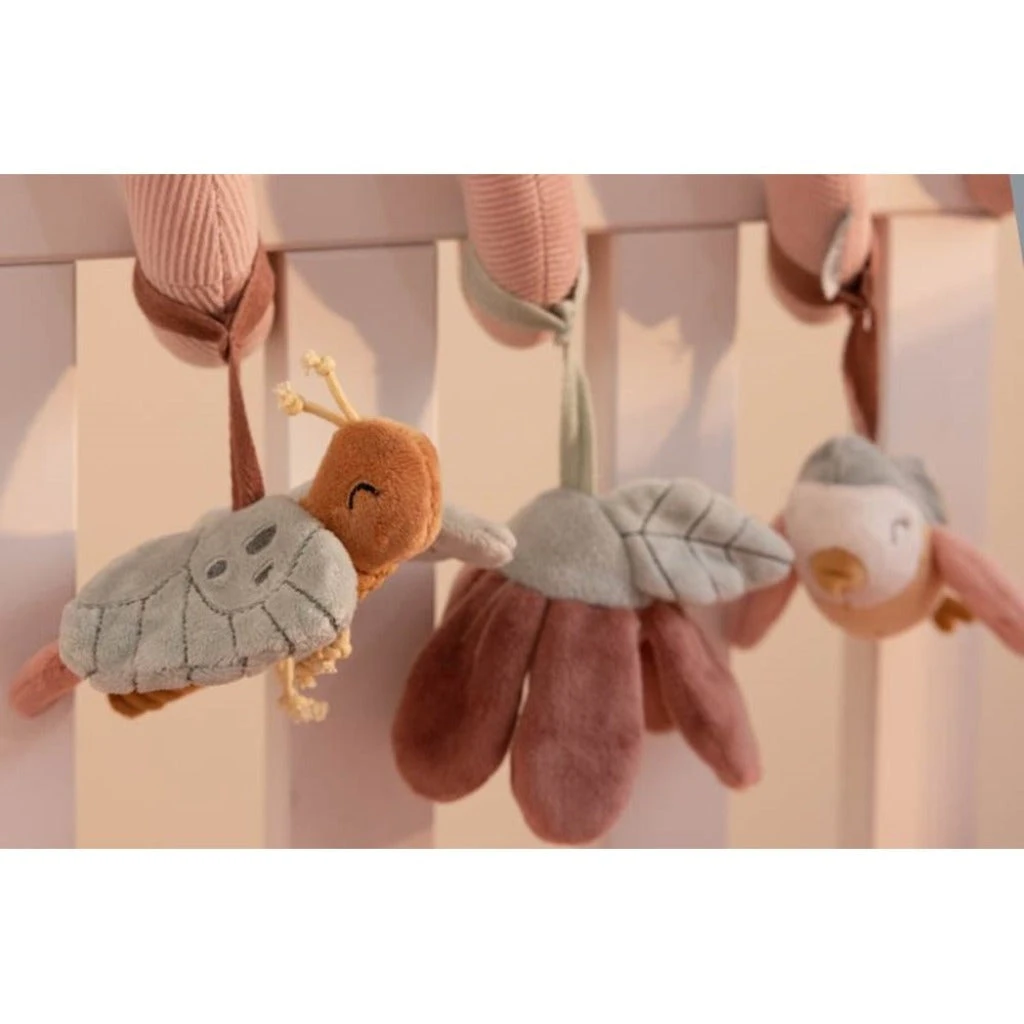 Crafted from corduroy and cotton, it features three different sensory characters, including a little bird, a colourful butterfly, and a captivating flower that makes a rattling sound.
