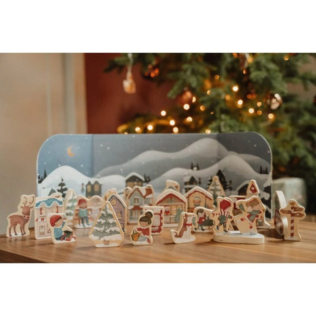 Open a package from the advent calendar every day in December to build your own Christmas village as the holidays draw near. The box features a sturdy cardboard back with winter-themed illustrations and 24 gift boxes containing 25 wooden figurines.