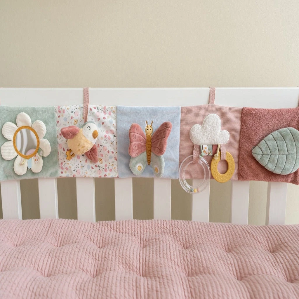 Made of different materials to touch and feel with lots of activities to explore. Look for the mirror! Give the rattling toy little a swing! And feel the surface of the teething ring!