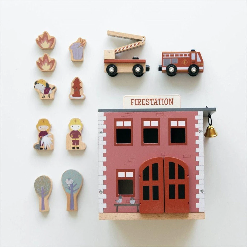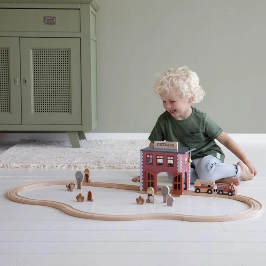 The expansion features fires, employees, trees, burning trash can, water pump, dog, fire truck with ladder truck and fire station. This wooden fire station is one of the many extension sets that can be connected to the Little Dutch railway train XXL set.