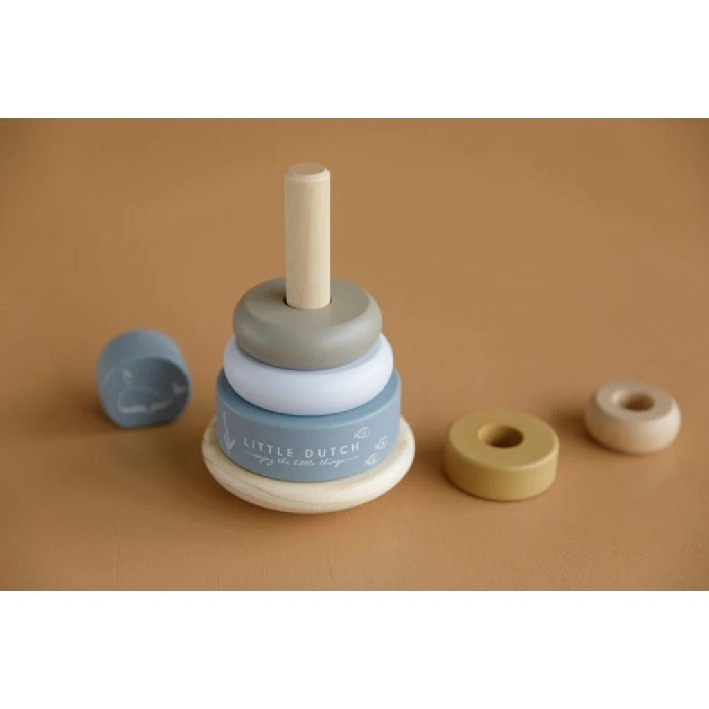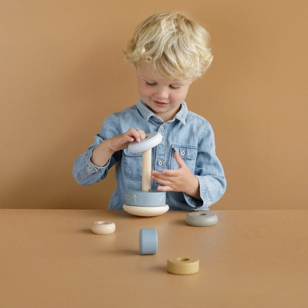 Children are encouraged to place the wooden rings in the correct sequence and stack them on the tower. That is quite a challenge, because the tower keeps rocking back and forth. Keep on trying, you can do it!