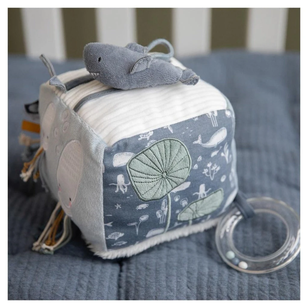 The soft activity cube from Little Dutch with underwater animals contains many activities that stimulate the senses of babies.