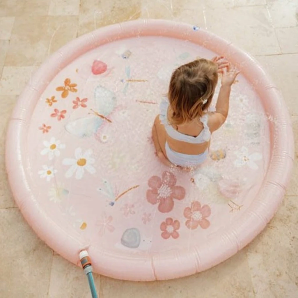 Playing with water on this mat is so much fun! This light pink water play mat is covered with beautiful illustrations of Flowers & Butterflies.