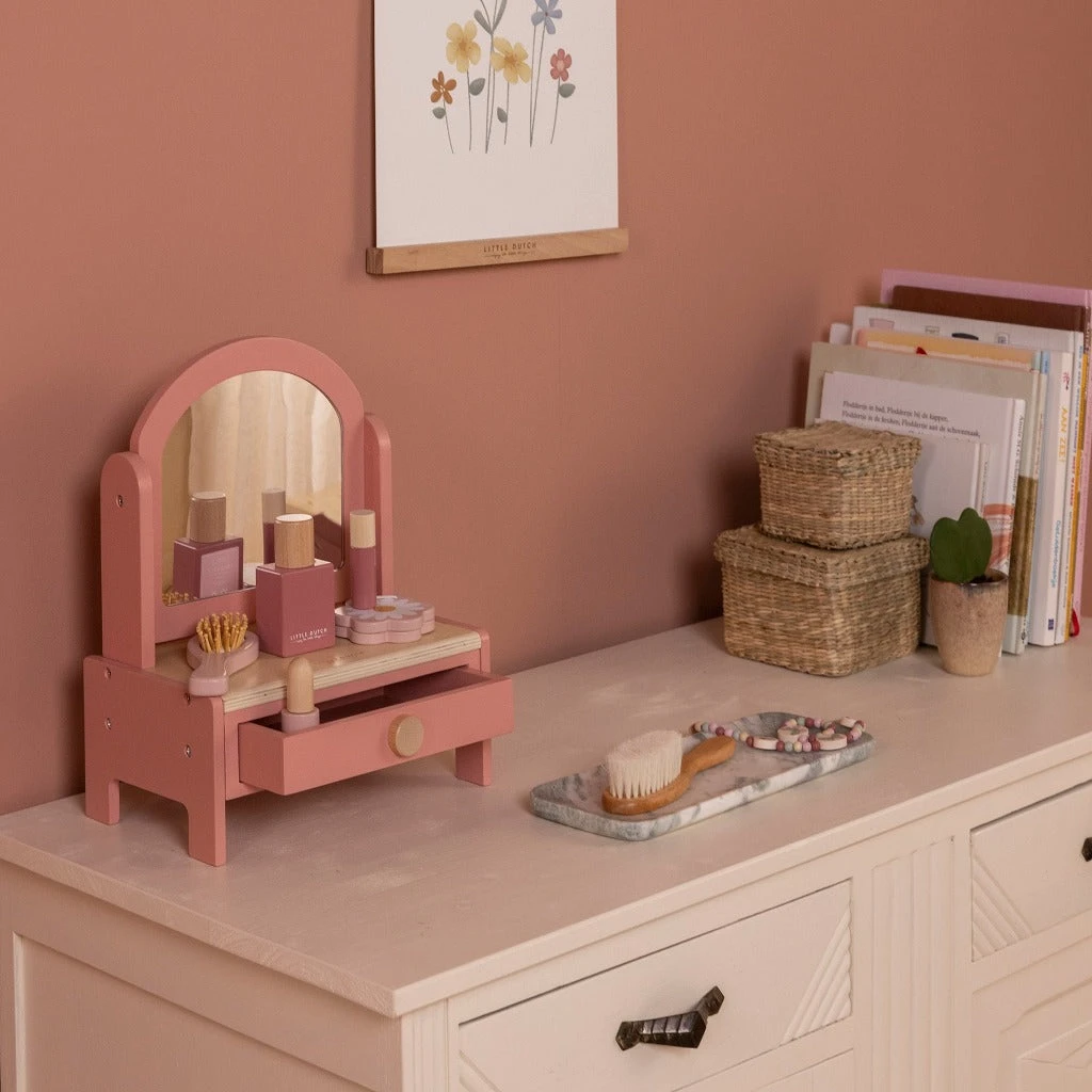 This wooden vanity table for tots is designed to encourage imaginative play. The vanity table comes with a rotating mirror and an array of pretend play beauty products, including a hair brush, perfume, lipstick, eye shadow, nail file and nail polish.