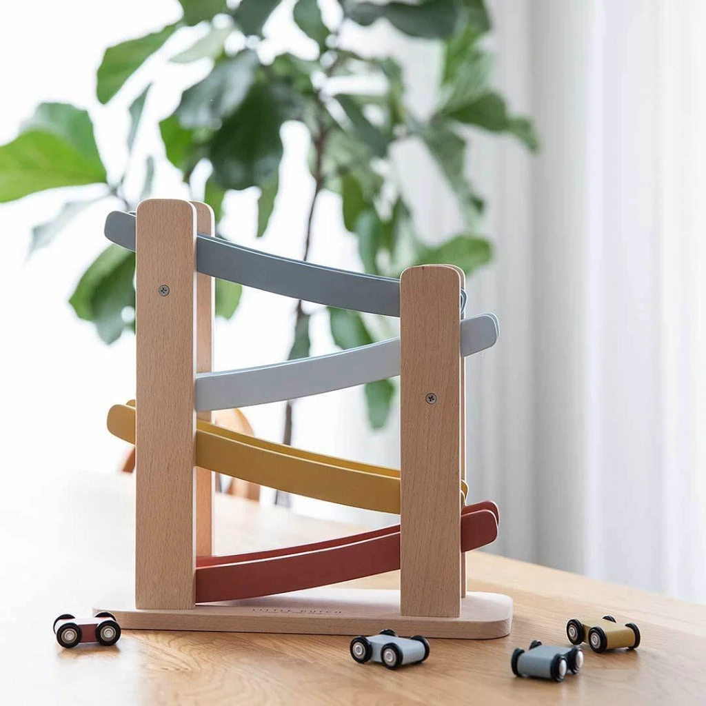 1, 2, 3, and start! With this cheerful wooden race track including 4 cars your little tot will have a great time. Place the cars one by one on top of the race track, let them go and they will race down. Tots love this!