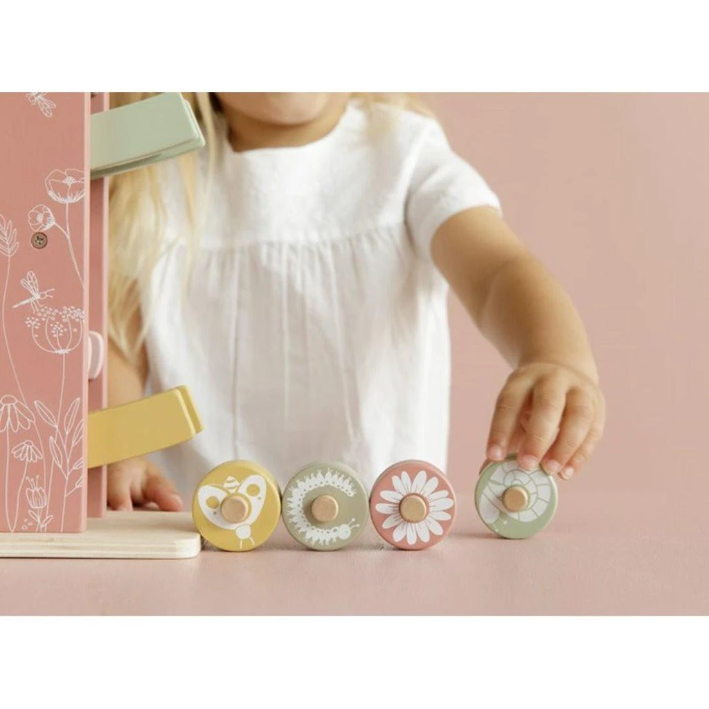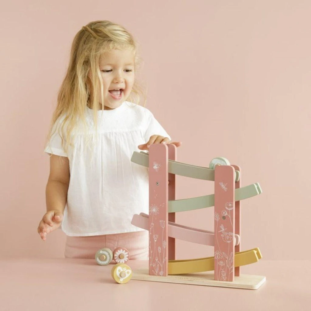 1, 2, 3, and start! With this cheerful wooden race track including 4 cars your little tot will have a great time. Place the beetle, caterpillar, snail and flower one by one on top of the race track, let them go and they will race down. Tots love this!