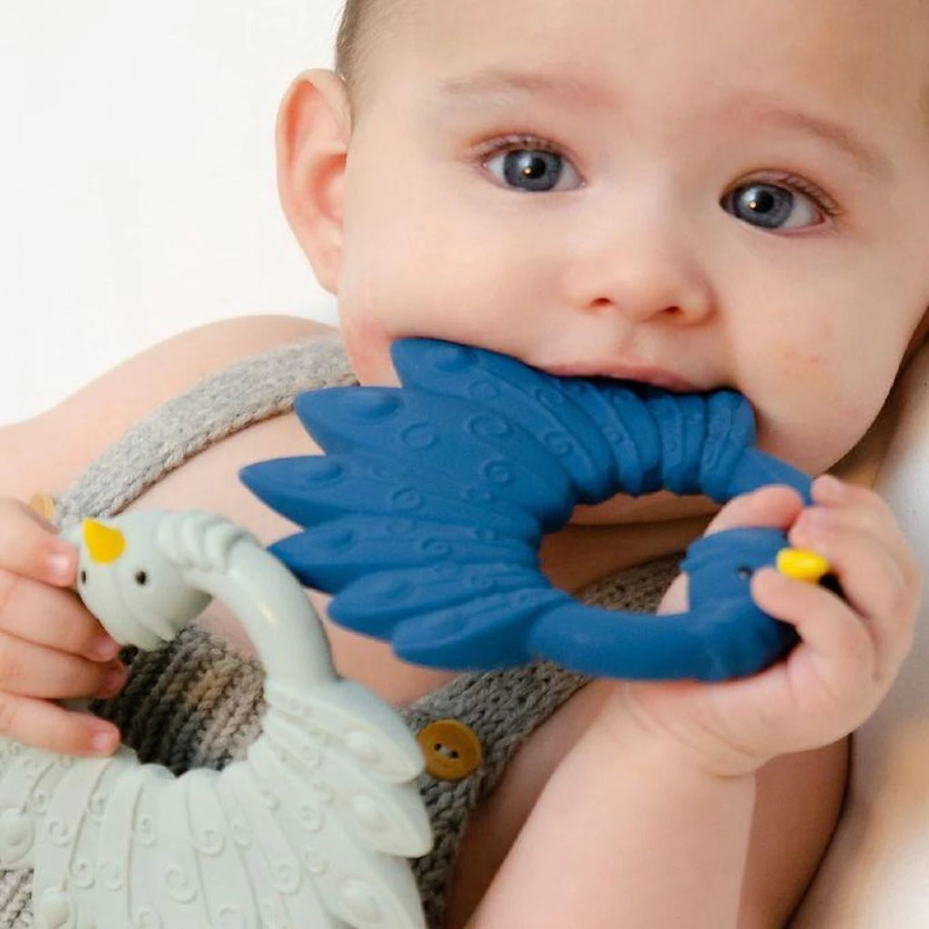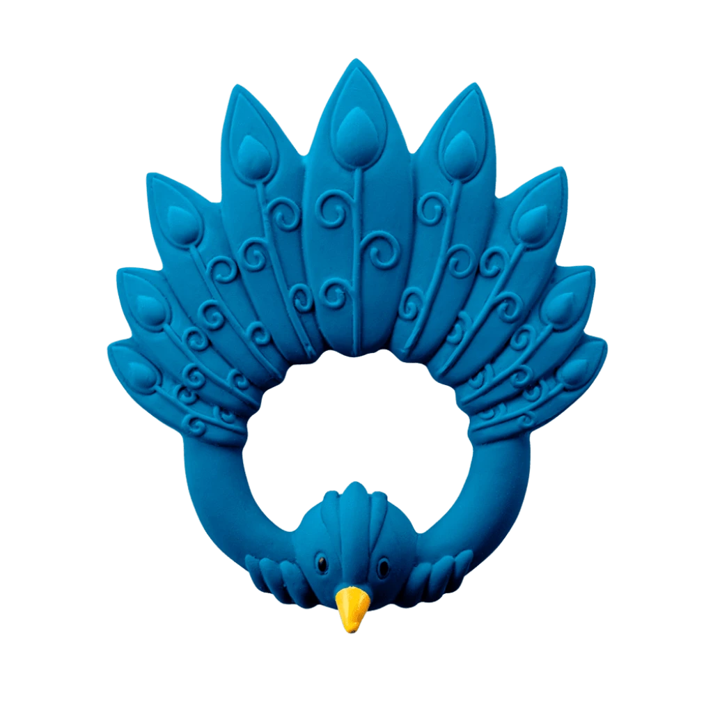 The beautiful and graceful peacock is now a stunning baby teether. The Natruba peacock is easy to grip for small hands with different surfaces to encourage sensory play and the soft natural rubber easily satisfies all stages of sore gums. Teething just got so beautiful!