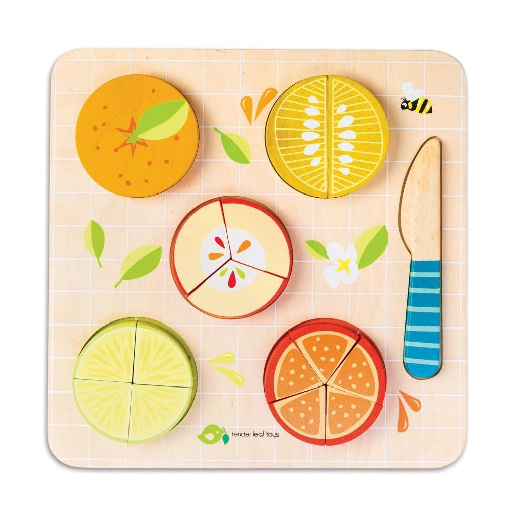 A 16 piece fruity wooden puzzle and knife to learn all about fractions.