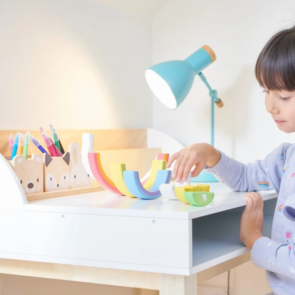 We have answered your prayers with this gorgeous addition to any tot’s bedroom or nursery! This completely plastic-free wood desk set has been made especially for tots, and has been designed for any craft activity or homework set up. What better way to work than on something beautiful?